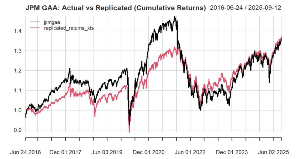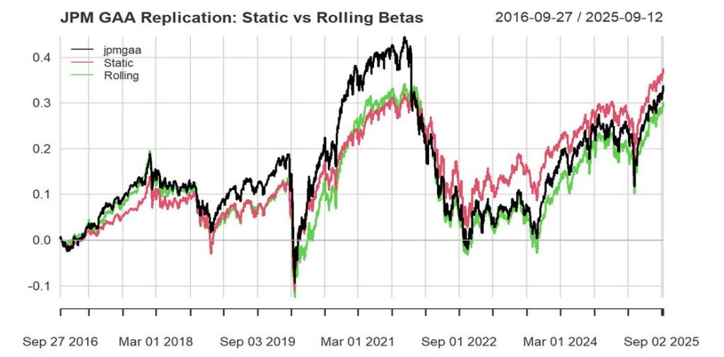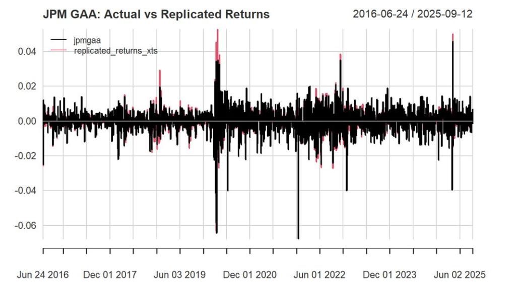 Fig 1: Actual returns of JPM GAA vs replicated returns-daily returns-statics betas (2016-2025)