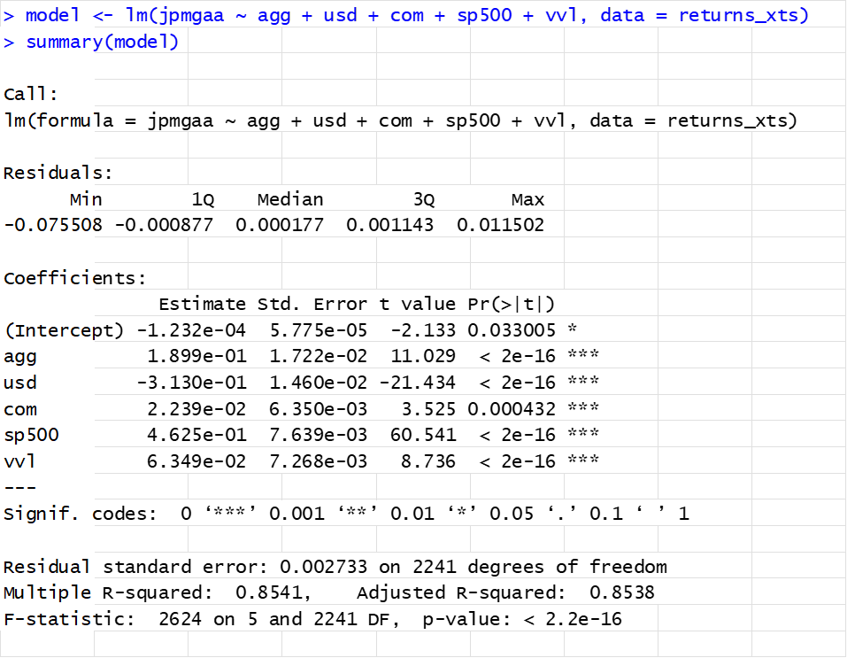 Then we run a multiple regression of the JPM fund on these asset classes/factors to determine the degree of exposure on these asset classes as follows: